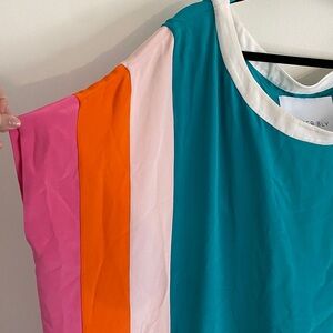 Vibrant and stylish, this dress features a mix of teal, pink, orange, and cream colors. Perfect for making a statement.