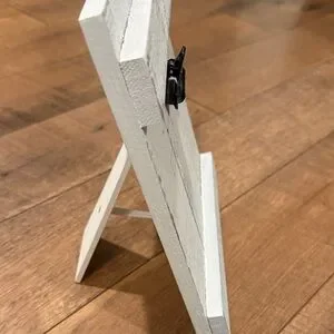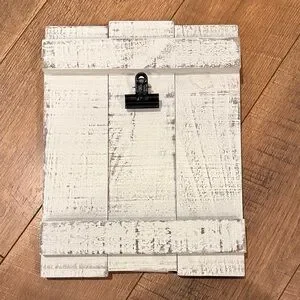 Charming rustic picture frame. Features distressed white wood. Includes clip for easy display.
