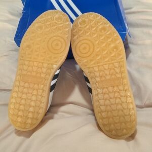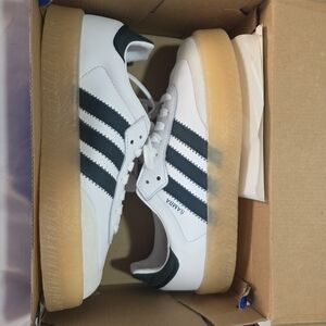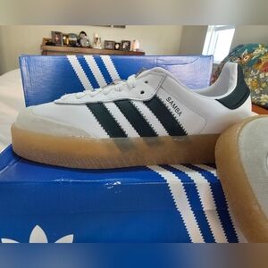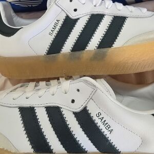 Classic Adidas Samba sneakers. White leather with green stripes. Gum rubber sole for traction. Ideal for casual wear.