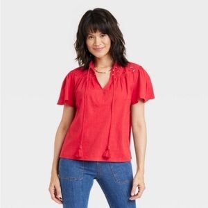 Women's Short Sleeve V-Neck Woven Eyelet Top - Knox Rose Red