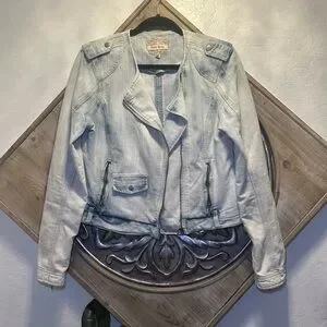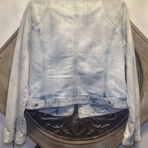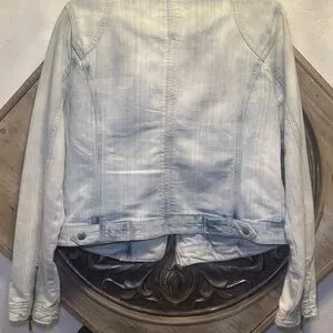Stylish light wash denim jacket. Features zip pockets and shoulder details. Ideal for casual wear.