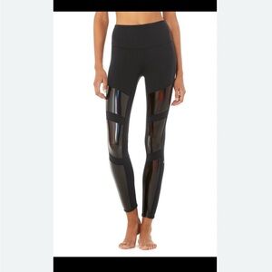 Sleek black leggings with stylish faux leather panels. Perfect for yoga or casual wear. Comfortable and stretchy fit.