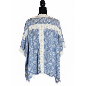 This Oli & Hali women's button-down shirt features a light blue denim-look fabric with a white floral and paisley pattern. It has short, wide sleeves and a relaxed fit. The shirt is adorned with white crochet lace detailing, including vertical strips down the front and back, horizontal strips across the chest and back, and circular crochet appliques on the front. It has a classic collar and a full button-front closure. The hem is frayed. Buttons are snap
