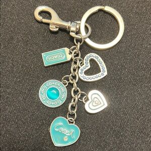 Chic Coach key holder with heart charms. Silver and teal accents. Perfect for keys or bags. No stones missing. Excellent condition.