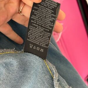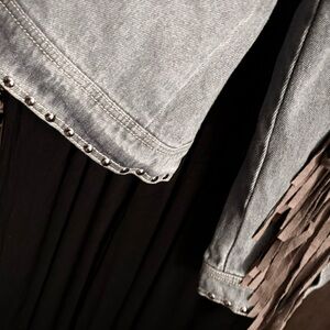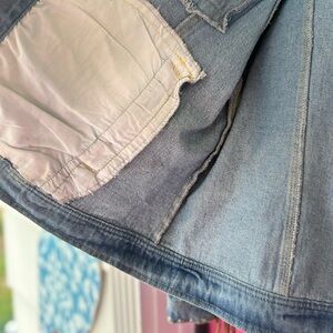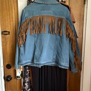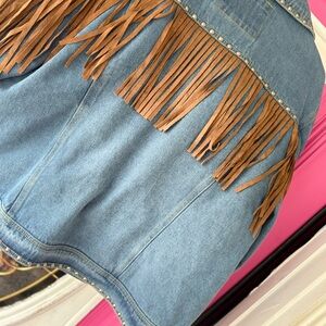 Stylish blue jean jacket with fringe detailing for a trendy look. Perfect for casual outings. Brand new with tags. Made very well. Very nice jacket!