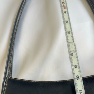 This black Gucci vintage shoulder purse from the 1960s is in good condition, except for a few minor issues like a zipper that gets stuck inside compartment. It’s free from noticeable scratches. The purse has a height of 19 inches from shoulder to base and a width of 11 inches. The stitching is tan and all the stitches are intact.