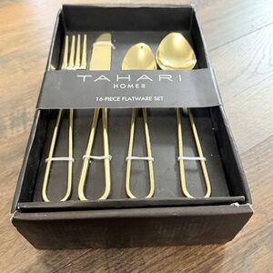 New Mid-Century MCM style Contemporary Gold color 16-piece Cutlery Flatware set by Tahari Home
