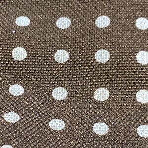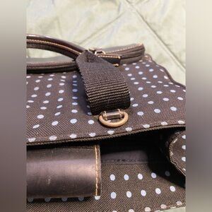 Very good VINTAGE condition, leather trim, canvas handbag with deep-roomy interior, geometric polka dot print and comes with removable crossbody strap. Measures approximately 8.5x4.5x11.25in., D- 4.5in., D- 4.5in. Please see photos for added info.