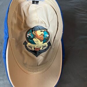 Stylish blue cap featuring a gold logo on the side. Perfect for casual wear.