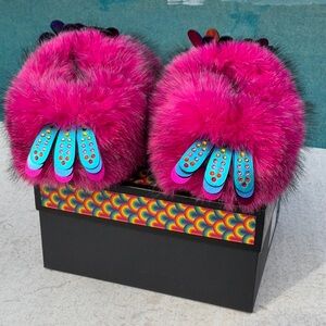Slip your feet in luxury, with these ultra soft, fuchsia colored faux fur slippers. They have metallic 3D wings & feathers with some crystals adding a uniqueness. If you want to make a statement in luxury these slippers are a must have. New in box comes with original bag as well. Receipt shows authenticity and where they were purchased.