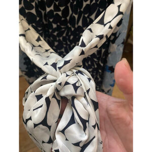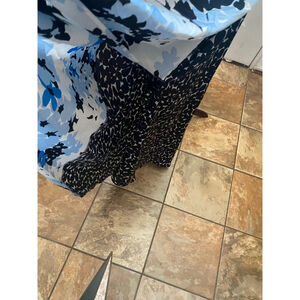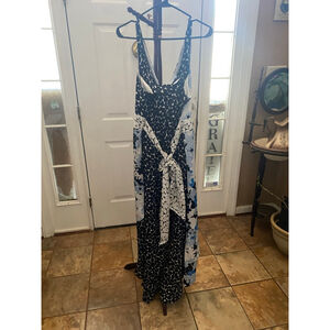 This New York & Company women's maxi dress, size 18, features a multi-pattern design in blue, white, and black. The top half has a V-neck halter style with a white and blue floral pattern on the front and a black and white abstract floral pattern on the back. The skirt transitions to a black and white abstract floral pattern, with a blue and white floral overlay. A tie-waist belt in the black and white abstract floral pattern is present. Has side zipper closure