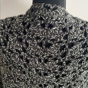 Stay cozy and stylish with this elegant black and white crocheted shawl. Perfect for wearing over any black or white dress.
