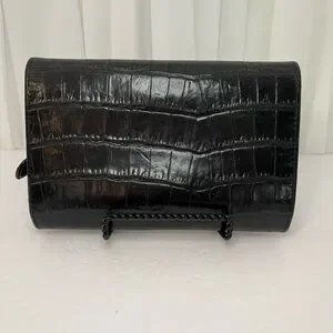 Chic black clutch wallet with crocodile texture. Features elegant silver corner details. Ideal for any occasion.