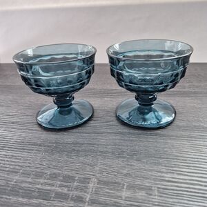 Blue dessert footed dishes. Dessert fruit sherbet dishes. Indiana glass Whitehall in Riviera blue. Holds 6 oz. Measurements are approximate measurements: 3 1/4" tall. Good condition. can be replacement pieces.