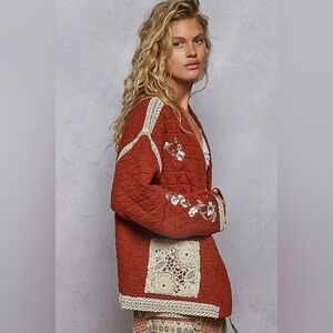 Keywords: pol jacket, quilted jacket, embroidered jacket, boho jacket, cottagecore, rust jacket, brick red jacket, floral embroidery, lace trim jacket, festival outfit, boho chic, free people style, boutique jacket, spring layering, fall layering, shacket style