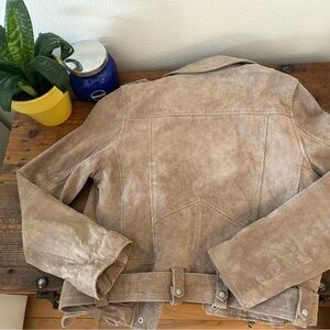Stylish tan suede jacket. Features silver zippers and buckles. Perfect for layering.