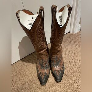 Beautiful intricate stitching in these ladies black and brown leather western boots. High Shaft. Good Quality thick leather. Stylish, Perfect for a bold, western look. Only worn a few times.