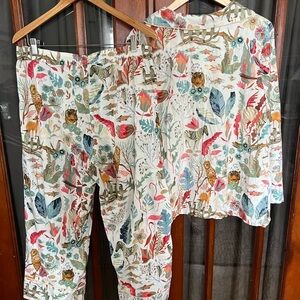 Anthropologie Michelle Morin Animalia Flannel PJ Pajama Sleep Set. Top is size 1x button down & Bottoms are size Large and roomy. See photos of waist flat and stretched. Vibrant floral and animal print pajama set. Features a mix of colors for a stylish look. Perfect for loungewear too. Fabric is lightweight and soft!