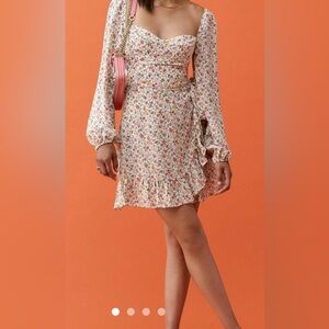 Fun and flirty but also classy dress with a floral pattern. Features long sleeves and a flowy fit and cute side knot. Ideal for any occasion