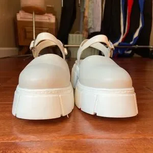 Free People Milan Mary Janes features rounded toe, slip on, platform Mary Jane style, color dune, adjustable ankle strap, rubber sole, leather exterior, lined foot bed, and size 9.5 (39.5).
