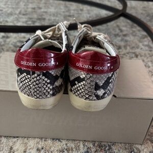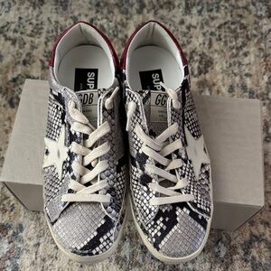 Chic Golden Goose sneakers with a striking snakeskin design. Features bold red and classic white accents. Golden goose sneaker, snake skin and red, great condition, comes with original box