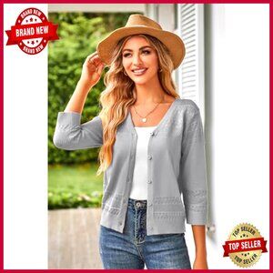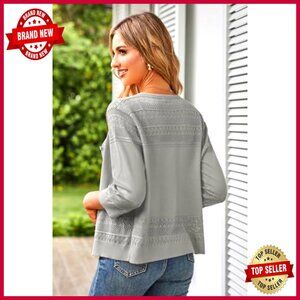 Cropped Cardigan 3/4 Sleeve Lightweight Crochet Shrug Hollowed-Out Knit Sweater
