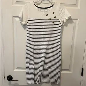 Stylish dress with navy accents and detailed bee embroidery. Ideal for everyday wear.