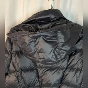 Perfect for cold weather, this coat combines sleek style with practical features. The glossy black quilted exterior offers a flattering silhouette, while the coat’s lightweight insulation makes it ideal for layering or packing in a suitcase.