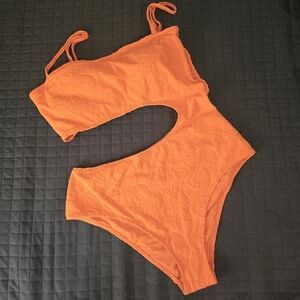 Absolute summer standout! This neon coral one-piece features a stunning textured floral jacquard fabric that’s super high quality. The asymmetric side cut-out and bandeau-style top give it a cool, modern monokini look. Perfect for beach days, boat trips, or styling as a bodysuit with denim shorts. 🍹✨