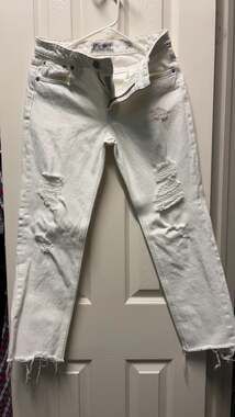 Lucky Brand Sienna Slim Distressed White Boyfriend Jeans, Size 2/26. These stylish denim pants feature a relaxed yet slim boyfriend fit in a crisp white wash.