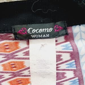 Size 3X Cocomo Woman lightweight slinky tunic blouse with bold Aztec print, V-neck with button front, roll-tab 3/4 sleeves, and functional patch pocket for relaxed boho, festival, or travel styling. Content tag missing feels poly cotton nylon jersey.