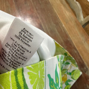 This is a pre-owned Talbots mini skirt, size 12, featuring a vibrant white, yellow, and green lemon and lime print. The fabric content tag indicates an exterior of 97% cotton and 3% spandex, with a 100% polyester lining. The skirt has a side zipper closure.