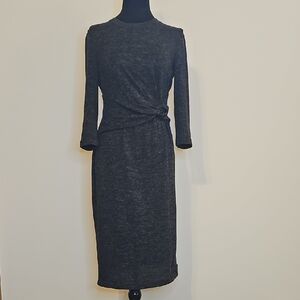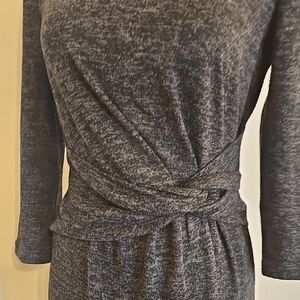 Features a stylish twist detail. Perfect versatile wear for going out or going into the office. The color is a heathered charcoal gray made from 84% polyester, 13% rayon and 3% spandex.