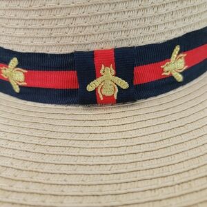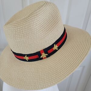 Excellent like new condition. Vince Camuto woven straw fedora style hat accented with navy/red stripes with gold bees. This one gives off Gucci vibes for sure. Adjustable strings inside to adjust for head size.