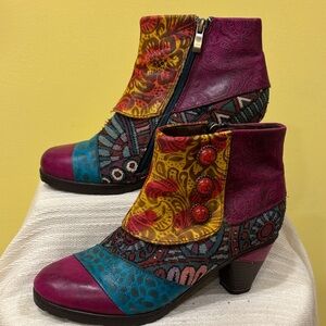 Step out in style with these vibrant ankle boots. Featuring a mix of purple, blue, and yellow hues, these shoes are perfect for adding a pop of color to any outfit. Enjoy the unique design and comfortable fit.
