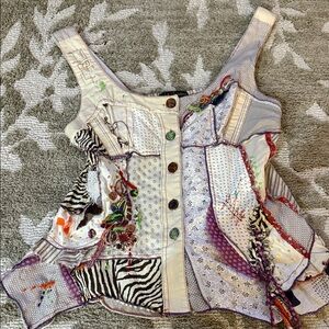 Eye-catching sleeveless top with a mix of patterns and colors. Features a button-up front and unique patchwork design. Pit to pit 17”. Shoulder to hem 23”