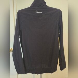Classic Patagonia half-zip pullover jacket in black. Lightweight yet warm, perfect for layering, hiking, travel, or everyday casual wear. Features a high collar, quarter-zip front, and iconic Patagonia logo at chest.