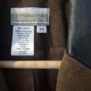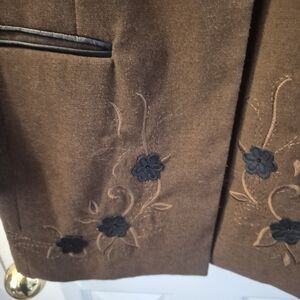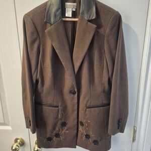 Coldwater Creek faux leather trim brown blazer with floral embroidery details.