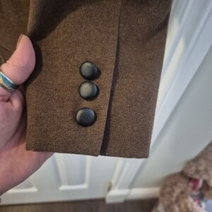 *Note missing button. Chic brown blazer with black floral accents. Features a single button closure and sleek lapel.
