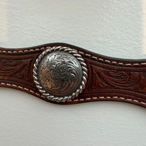 Stylish brown leather western belt featuring a detailed silver buckle.