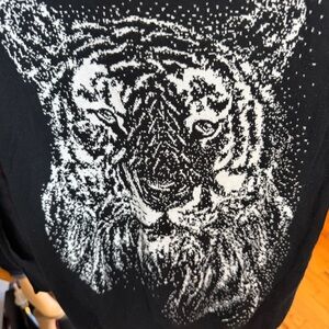 Bold, edgy, and perfect for fall/winter layering — this ZARA Longline Tiger Graphic Sweater in Size Large features an eye-catching white tiger design across the front. A true statement piece that works as a long sweater or a sweater dress, depending on height and styling.