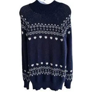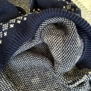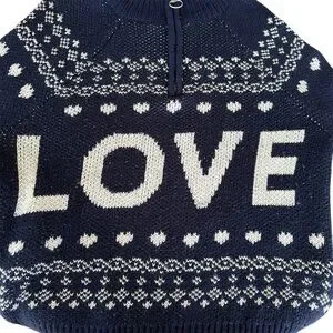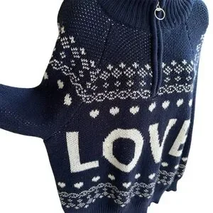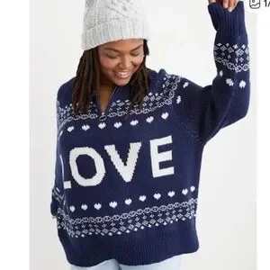 Cozy navy sweater with 'LOVE' design. Perfect for warmth and style. Super soft comfortable drop shoulder half-zip sweater. Double stitching criss-crossed as you can see in the pic of the inside of the sweater. Perfect for winter. Boasting a message that we could all use right now. Good condition but has some pilling happening. Otherwise, in good shape. Stretchy.
