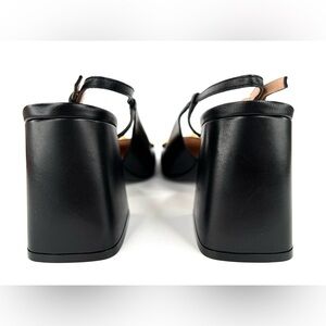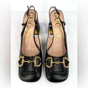 Chic black leather heels featuring gold hardware. Sleek design with a bold block heel.
