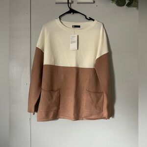 Stay cozy and stylish with this elegant two-tone sweater. Featuring a chic beige and white design, it's perfect for any occasion. Enjoy the soft, comfortable fit and practical front pockets.