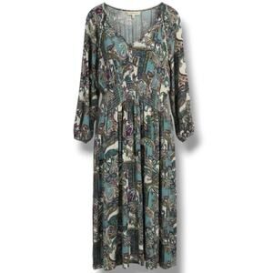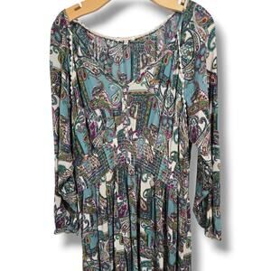 Beautiful teal and multicolor paisley midi dress with a soft 100% rayon feel. Features a relaxed boho silhouette, gathered waist detail, lightweight long sleeves, and a scoop neckline with button accents. Flowy and comfortable with a flattering drape. Gently used and in great condition. Approx. 47" length.