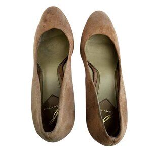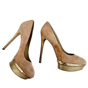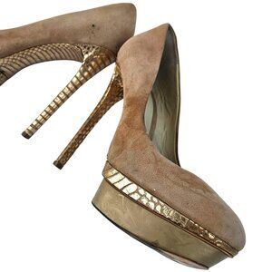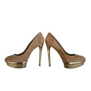 Brian Atwood Suede Platform Pumps in Beige with Pink-Gold Snake Trim – Size 11