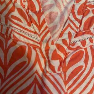 Lane Bryant Coral and White V-Neck Blouse. This vibrant coral and white geometric leaf-patterned top features a flattering V-neckline.
