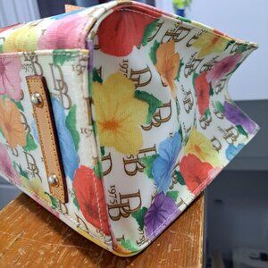 Very good pre-loved condition! Colorful floral pattern has a clean exterior and interior. Interior has one zip pocket and three slip pockets. Can be carried as a handbag or add the strap for a shoulder bag. Corners, handles and strap all in nice condition. Magnetic closure flap has slight "wear" (a water spot - maybe a rain droplet!, and a tiny puncture mark). In my opinion, this bag is in very good condition with minimal wear. The Janine bag is stylish, an easy carry and roomy! Approximate measurements are 11.5"W x 9" H x 6"D. A standard blue D&B dust cover is included.