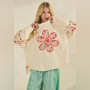 Cream sweatshirt featuring a large floral design and colorful patterned sleeves. Perfect for a casual, stylish look. Hi low. Oversized 85 cotton and 15 polyester. Comfortable and comfy cozy