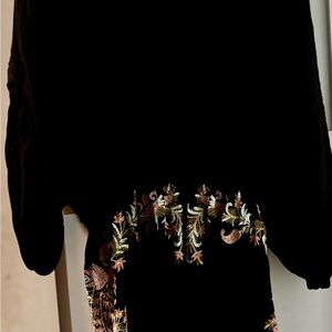 Turn heads in this stunning Free People black embroidered mini dress. Featuring intricate floral embroidery in soft blush, sage, and gold tones, this dress is effortlessly feminine with a touch of vintage charm. The voluminous balloon sleeves and cinched waist create a flattering silhouette, while the lightweight fabric makes it perfect for year-round wear.